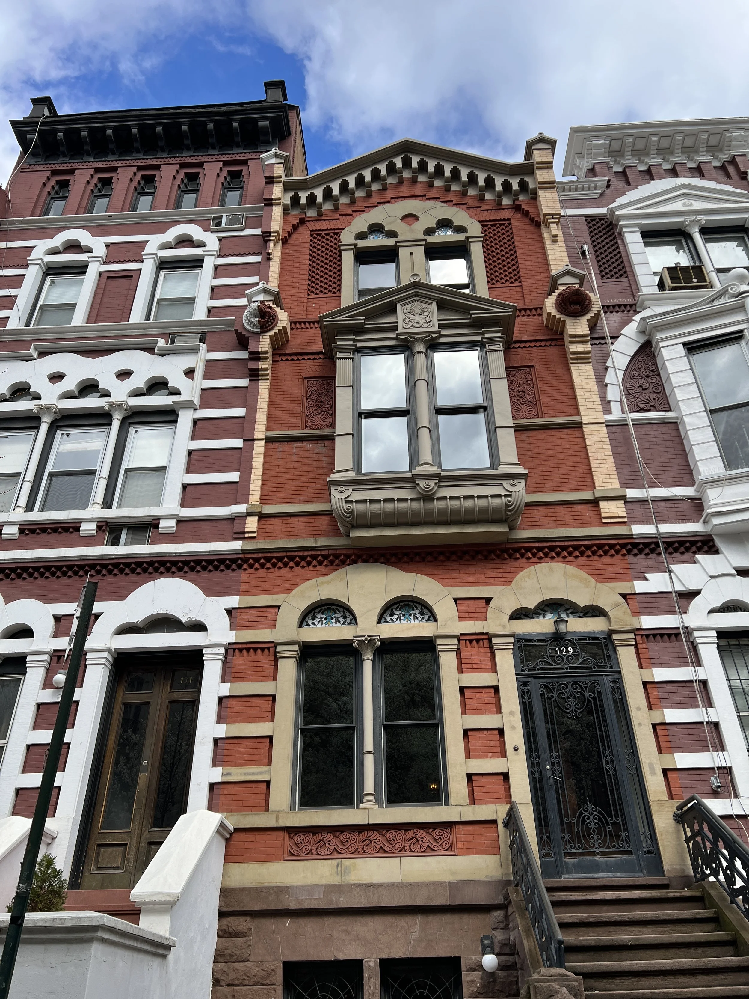 123- 133 W 95th St. (ca.1890) A six-house group using an A-B-C-C-B-A pattern, with the convex bays of the “A” houses serving as “bookends” for the composition. (Sadly, one of the “C” houses has lost its stoop, which really spoils the effect).