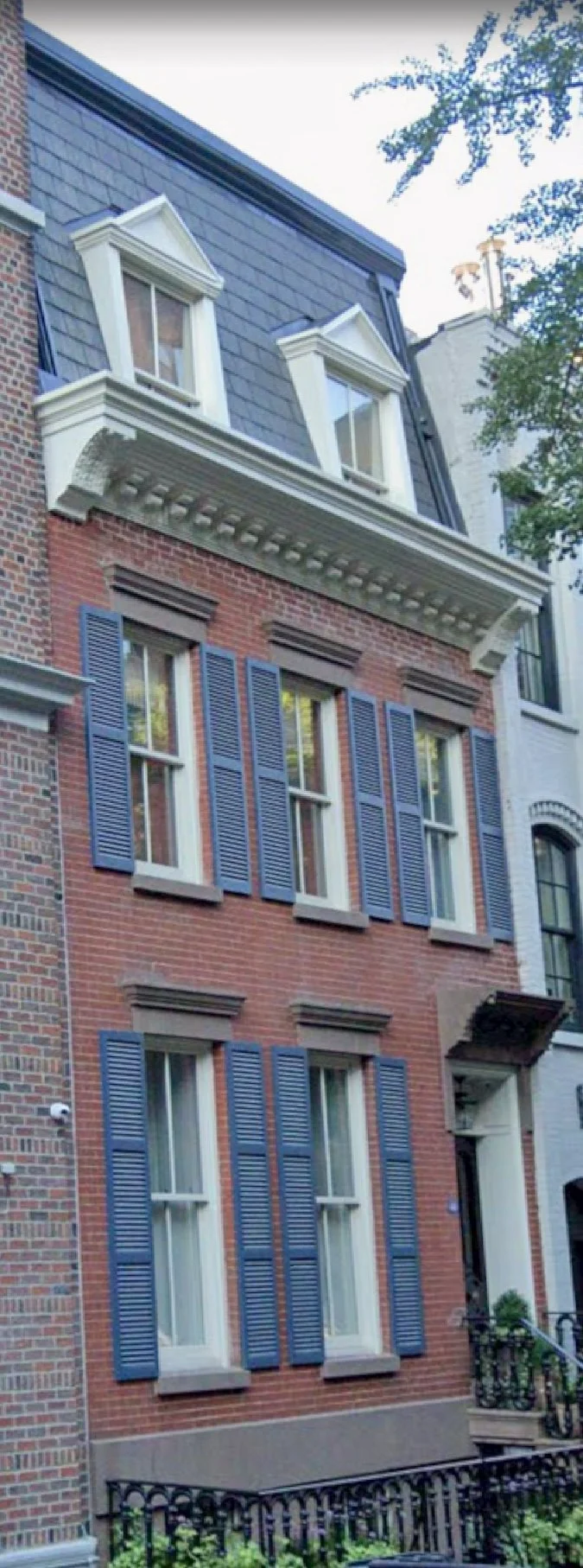 48 W.10th St. (1829), Greenwich Village. Occasionally, French Second Empire mansards and dormers were used expand existing houses; in this case, a Federal Dwelling was extended as part of its “modernization” in 1871.