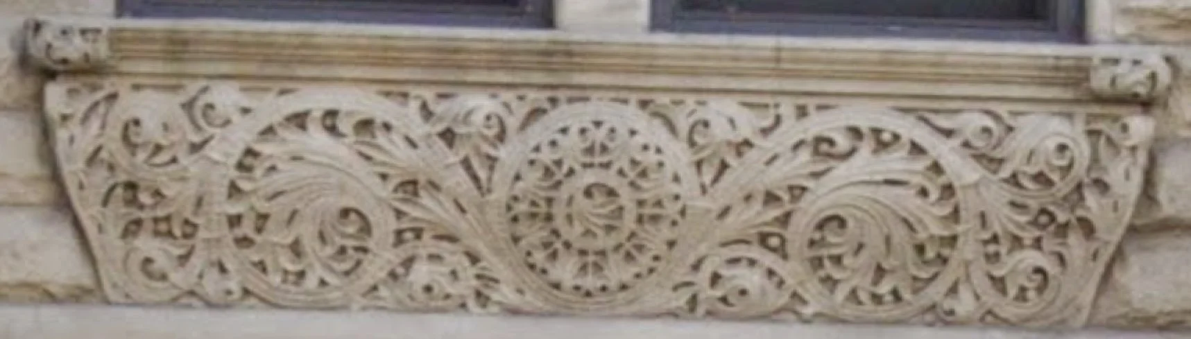 2) incised carving of stone to make both stylized vines, leaves, flowers and geometric groups of straight grooves, dots or panels. This type of decoration was enabled by the contemporaneous development of machines that could do this carving cheaply.