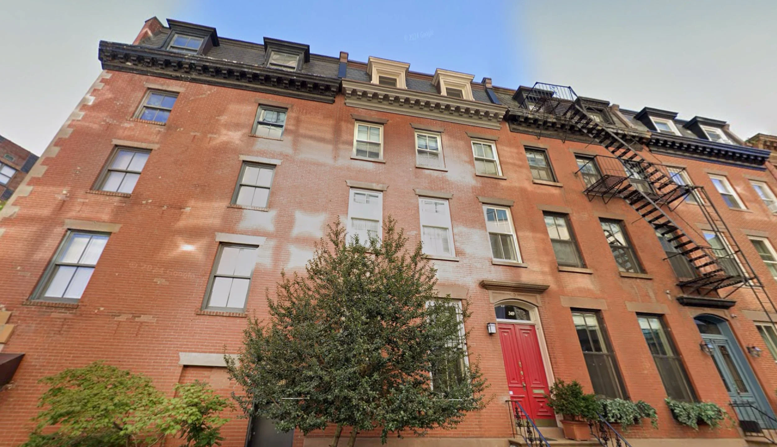 As discussed in the section on Federal Dwellings (1795—1835), the Brownstone emerged suddenly and the Federal Dwelling ceased to be built at the same moment, with very little evidence of transitional forms or overlapping production of the two types. Of course, they share important characteristics, but signature features of the Federal house design, its gabled roof, attic floor and dormers, abruptly vanish in 1835. The internal layouts of the two types are also very different, making hybrids difficult, which can be surmised from the fact that we cannot find any evidence of hybrids combining features of both types. What we do see is that, in most cases, Federal Dwellings were “modernized” to effectively resemble Early Brownstones. Attics were raised to become full floors with an added row of windows. This meant that the dormers had to go and a horizontal, projecting cornice, with frieze, would be built. These makeovers were almost always carefully done with matching window details, but usually the brickwork betrays the addition, not matching the lower Flemish bond pattern that was universal for Federal Dwellings.